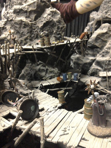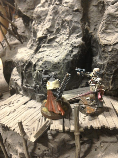 The gunfire was heard by Tybalt Voss, who quickly got himself into cover, and fired off a torrent of full auto fire above the ladder. On the other side of the spur, Inquisitor Malik, now hearing the gunfire and frustrated at not being close to the action, pulled Jeremiah Aspen past him on the walkway and ordered him up the stairs with some choice language. Aspen climbs the ladder and sights Harrow's Pyremaster Korbin advancing towards him with pyrestaff in hand.