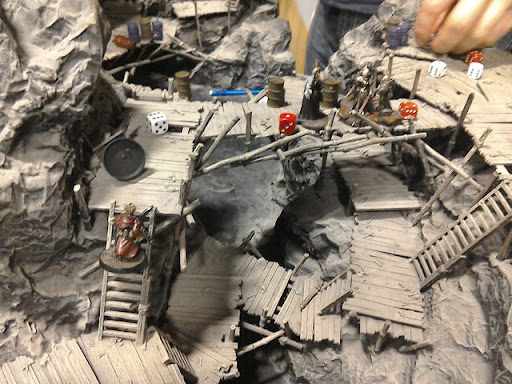 On the other side of the fray, while on the ladder the militiaman Yameck decides to ready and toss a grenade (with precision accuracy, indicated by the white dice in the pic!) over between the now prone Eins and the rest of the Salia's band. This goes off, though it only causes light damage to Eins' leg, however the concussion of the blast knocks down Salia and the Sorcerer, though the damage is little more than cosmetic. Tybalt Voss decides to get up from his position in cover and heads over to Malik's position, hearing his leader shouting and cursing and the screams of Jeremiah Aspen as he is barbecued in the name of the Inquisition.