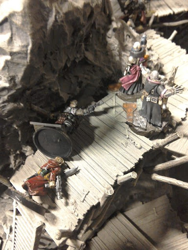 Turn 5. It's all going on at the bridge!Harrow is first up, and in reply to the barrage of shotgun fire by Dwei, neatly draws his chainsword and decapitates him with a contemptuous first sweep of the game. He then blocks the way of Salia, who takes some shots at him with her pistol while advancing down with his former prisoner.